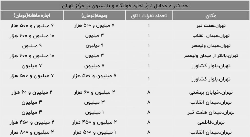 بررسی آگهیهای نشان میدهد برای اجاره پانسیون و خوابگاه در مناطق مرکزی تهران باید ماهانه از ۲ تا۱۱ میلیون تومان هزینه کنید.