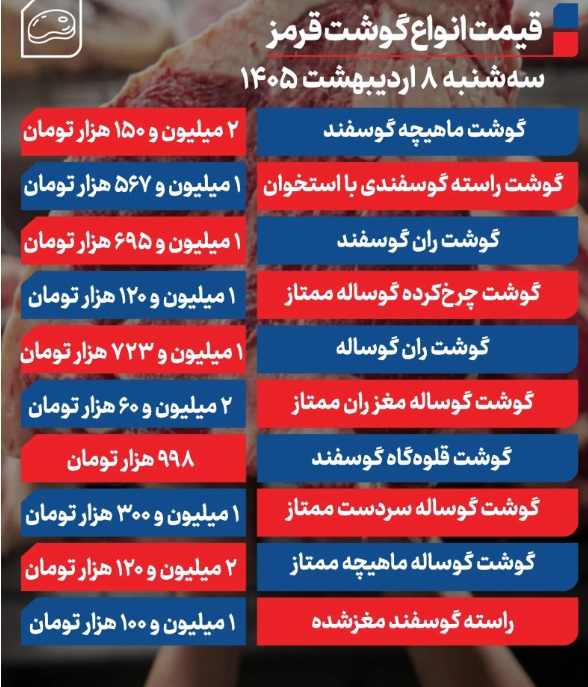 قیمت گوشت قرمز امروز ۸ اردیبهشت ۱۴۰۵ اعلام شد.